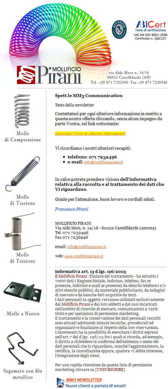 Redazione della newsletter e messaggio pubblicitario, invio mail al database acquistato. Gestione, monitoraggio delle fasi di invio e report sulle operazioni eseguite.