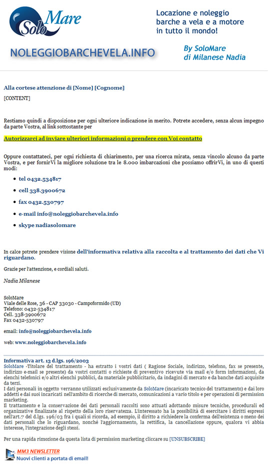 Servizio MM3 Newsletter con creazione grafica delle struttura template personalizzata rispetto le specifiche esigenze comunicative del cliente. Creazione del messaggio integrato di default a norma privacy per gli invii in autonomia da parte del cliente.